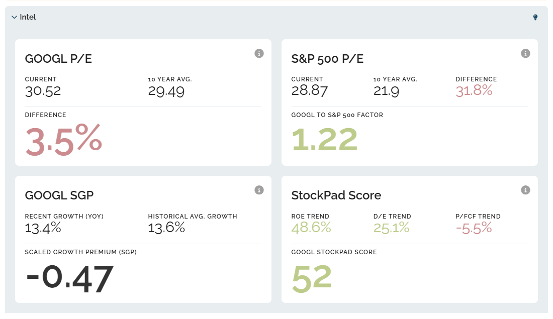 In the Intel section you will find key metrics for the stock — computed by StockPad. You can click the 'i' icon in each box for more details. This section was introduced December 2025, and the algorithm used for the final 'StockPad Score' may be tweaked. If so, this will be recorded in the Updates Log.